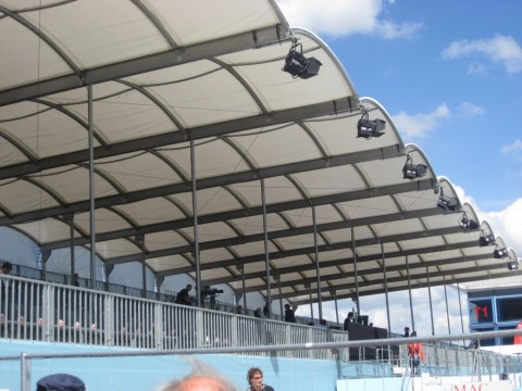 Vorher gab es ein Showprogramm auf einer eigens für die Veranstaltung aufgebauten Bühne vor zahlreichen geladenen Gästen auf der Tribüne und noch zahlreicheren Gästen auf dem Vorplatz. Ich möchte lobend erwähnen, wie gut auch Zaungäste (im wahrsten Sinne des Wortes, wie man auf meinen Fotos erkennt) die Taufe miterleben konnten, das war sehr gut geplant.